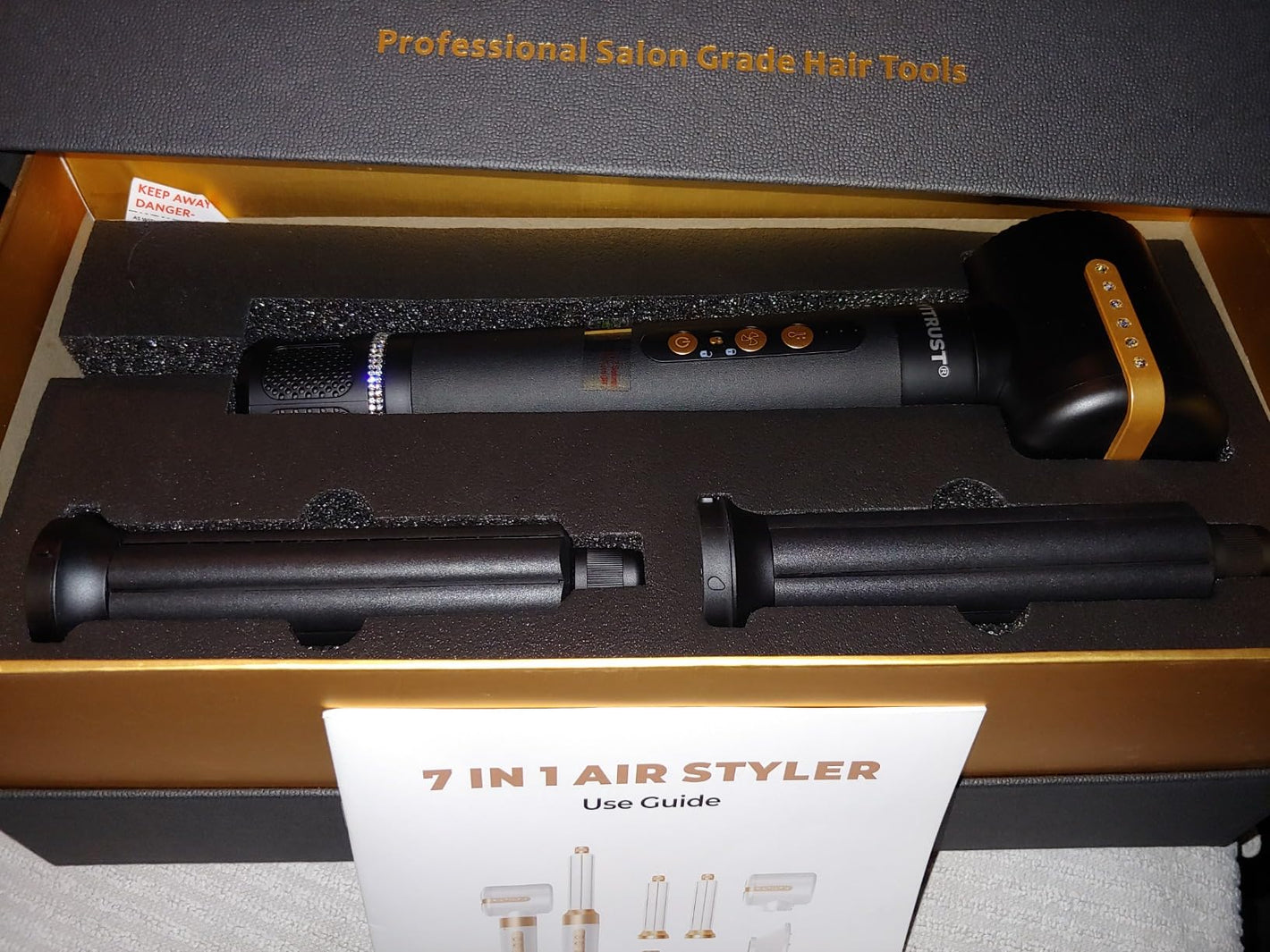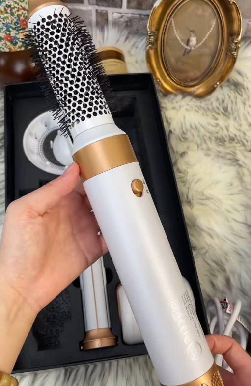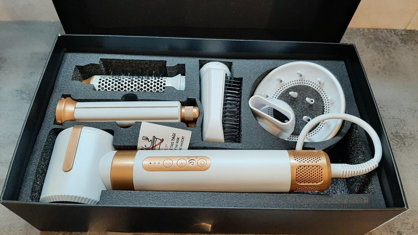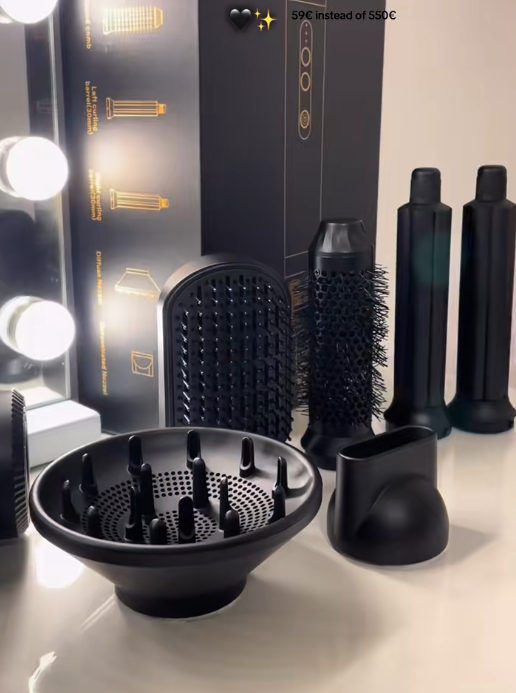 Le kit NOVRAY®️ comprend 7 embouts différents : boucleur automatique, brosse volumisante, embout lissant, diffuseur, sèche-cheveux puissant, massageborste et un embout supplémentaire pour finition. Chacun est conçu pour un style spécifique et pour protéger vos cheveux.