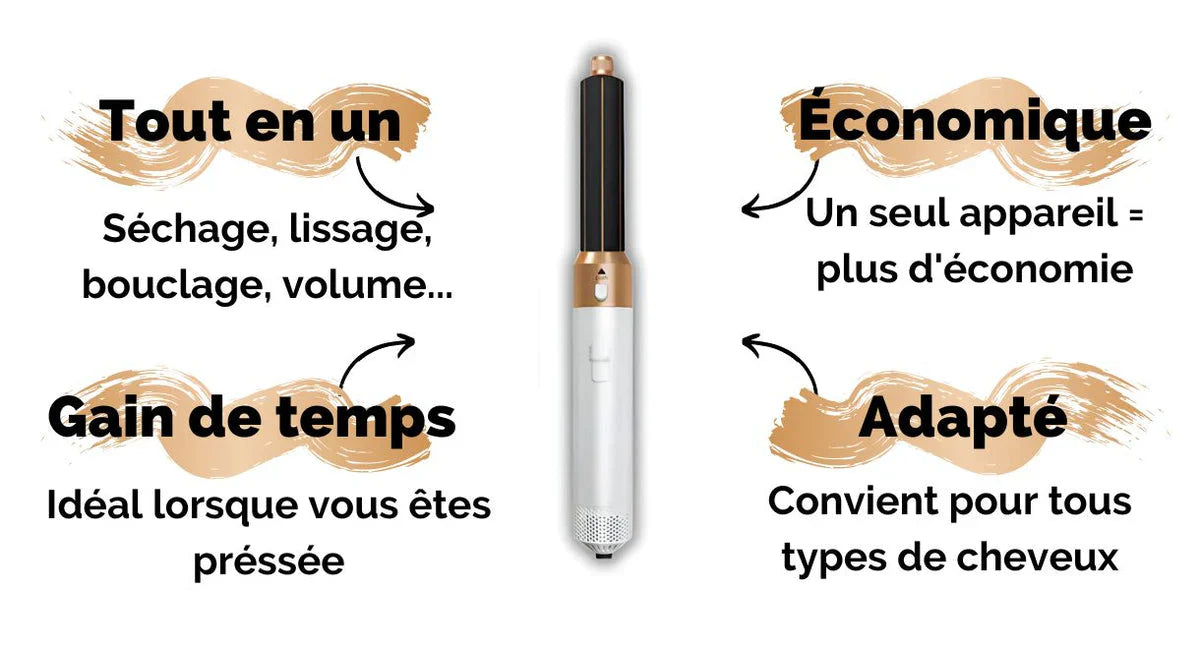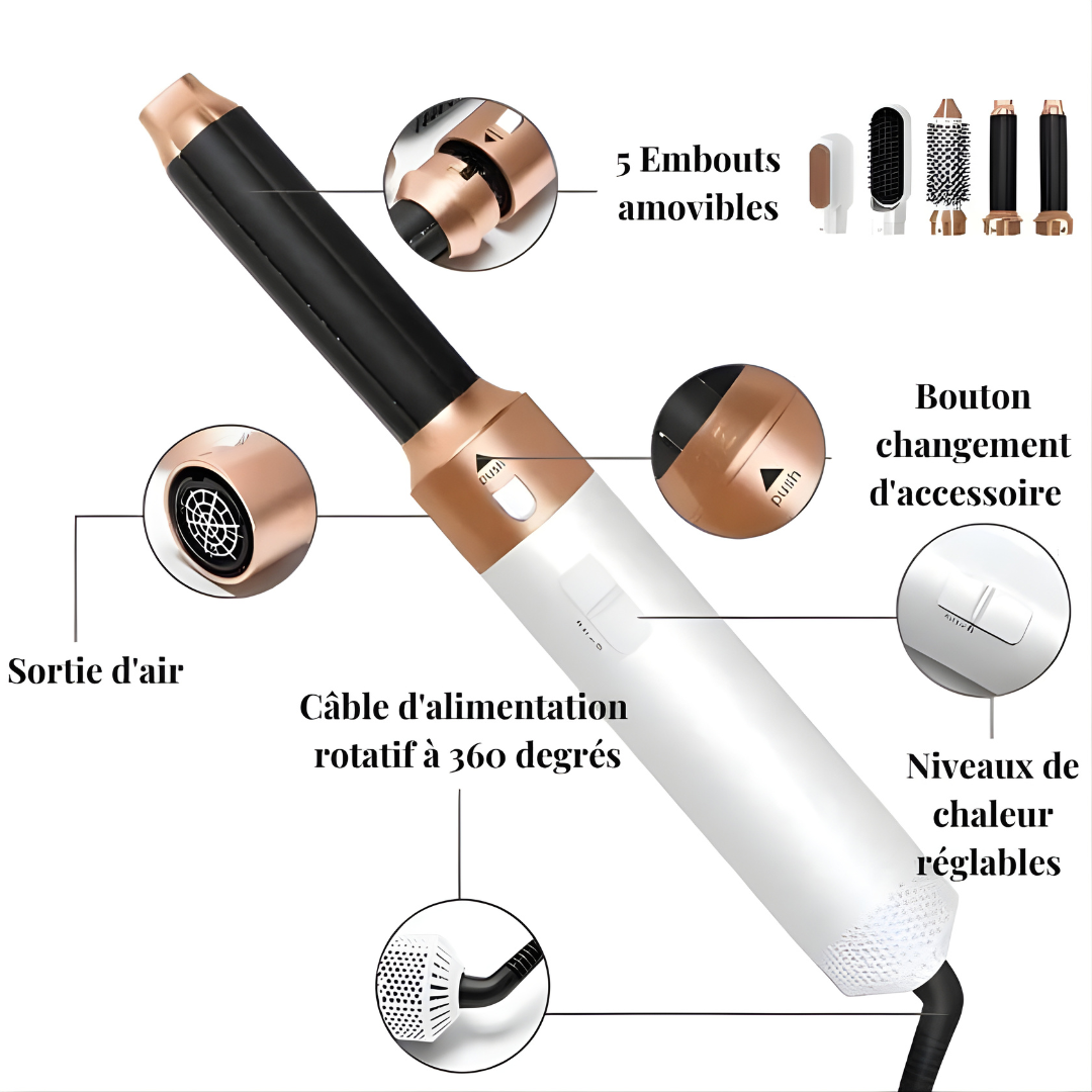 • 5 embouts polyvalents pour lisser, boucler, sécher ou coiffer vos cheveux selon vos envies.